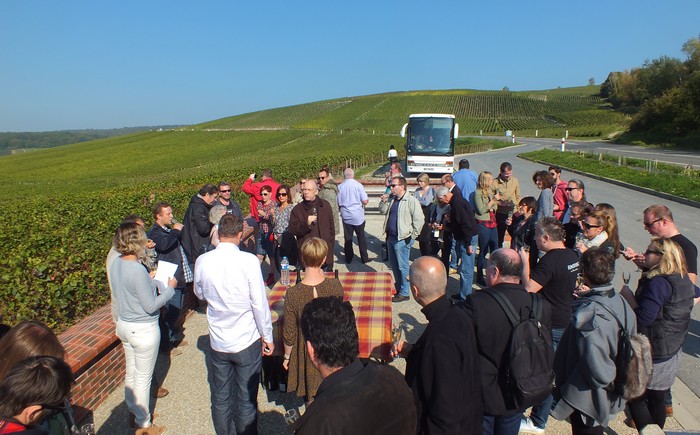 Le rendez-vous est fixé le 4 octobre à 11h00 sur une place de Reims. Delphine et Francis nous y attendent ... et un autocar. Un grand, comme les affectionne Emmanuel Macron. Il faut dire que nous sommes plus de 40 personnes. Faut les caser ;-) Durant tout le voyage, Delphine nous expliquera la spécificités des différents crus locaux. Nous traverserons Hautvillers, Dizy, Damery, Cuchery, Gueux...